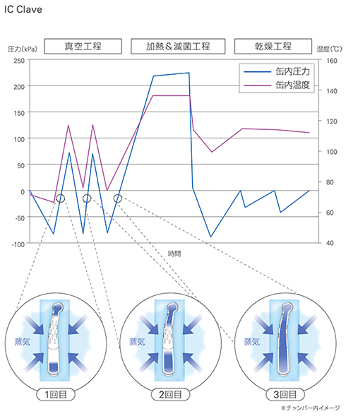従来の高圧蒸気滅菌器の場合、複雑な形状の器具やハンドピースなどを滅菌する際、内腔に残る空気のため蒸気が届きにくく、滅菌が不十分になる場合があります。 ICクレーブは、滅菌前に真空状態と蒸気の注入を3回繰り返すことで、内部に空洞のあるハンドピースなどの器具内部の残留空気を全て取り除き、蒸気を細部までいきわたらせることによって、器具の内部まで完全な滅菌が可能となっております。